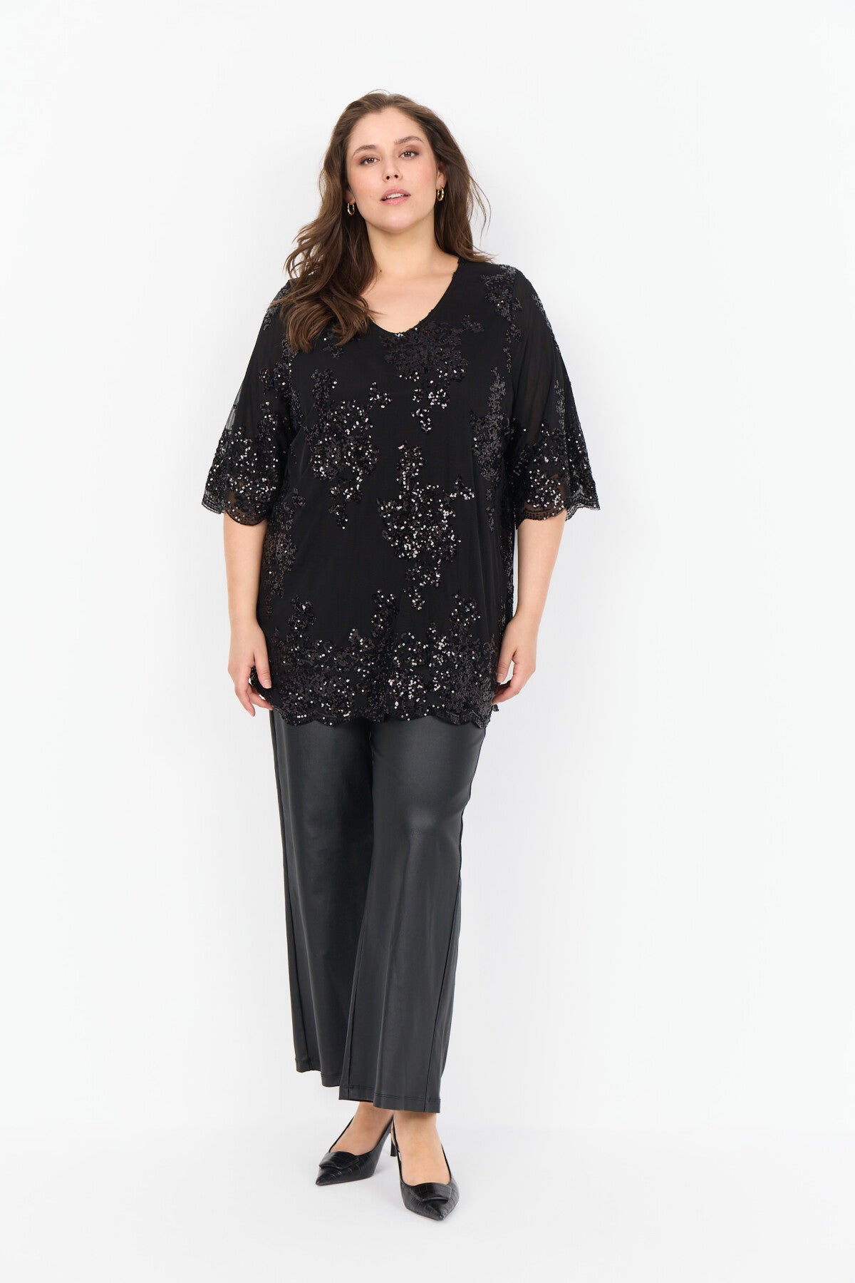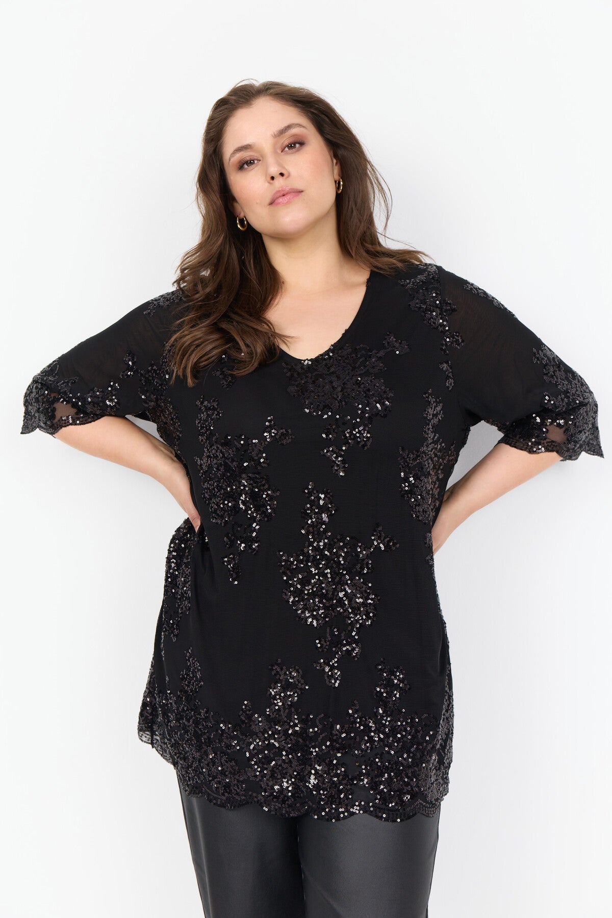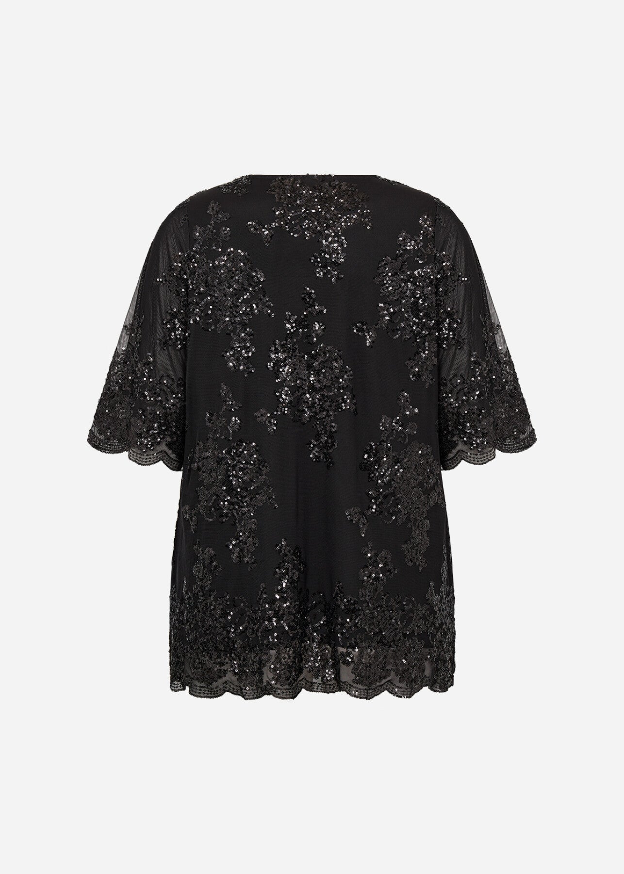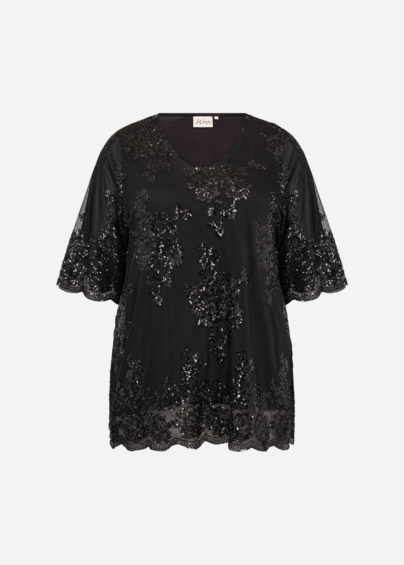 WA-SUNN 1 Blouse is crafted from 95% Polyester, 5% Elastane. This elegant blouse features short sleeves, sequin details, a round neckline, and a relaxed fit. Pair it with tailored pants or a sleek skirt for a cool look.