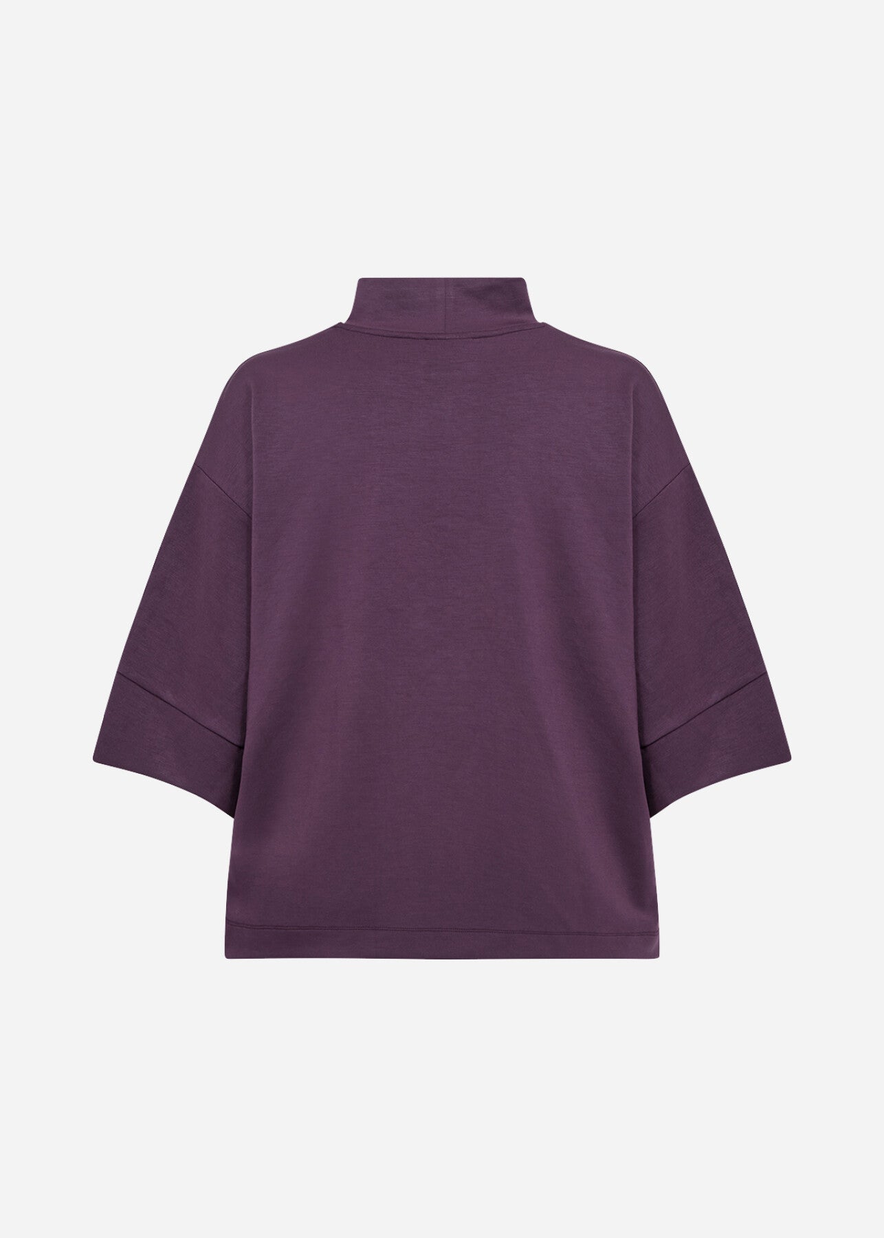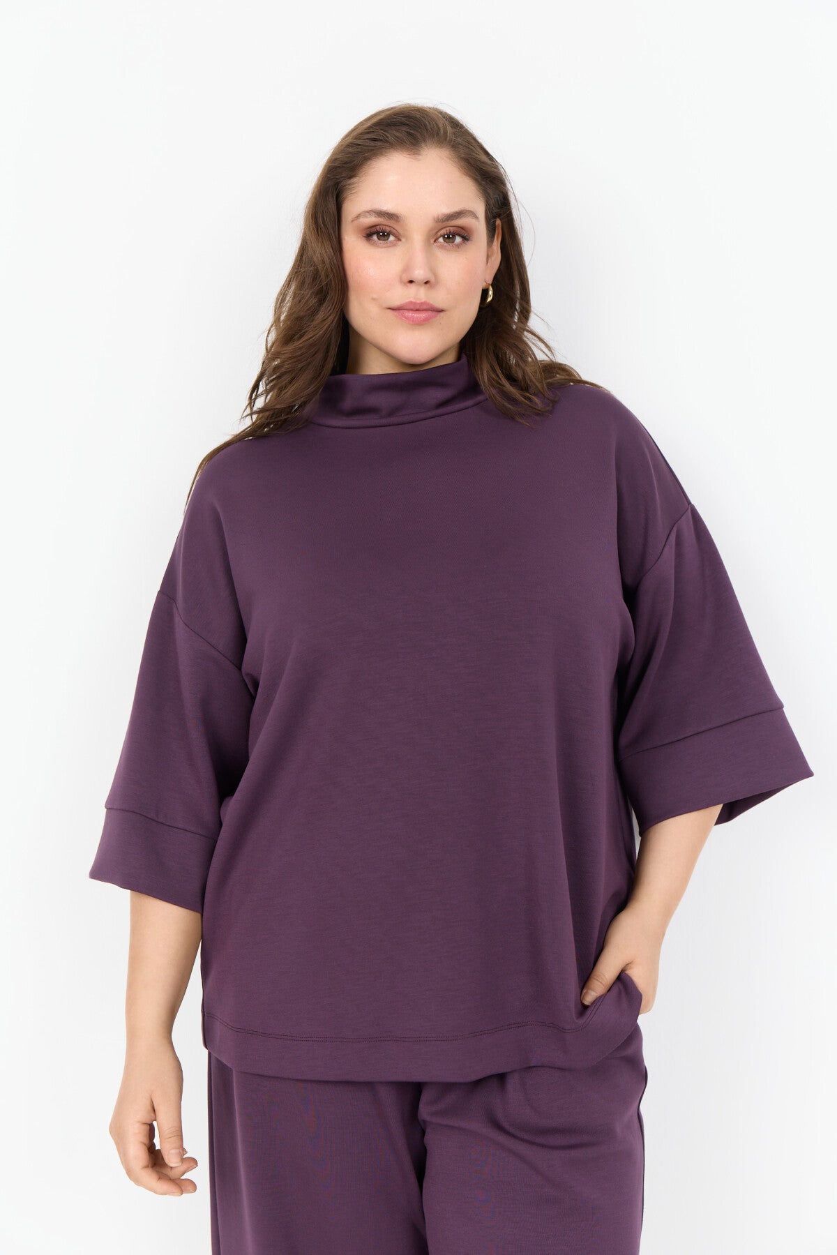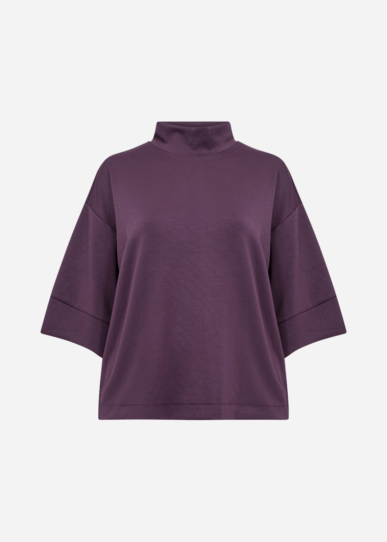 WA-SABINA 64 is a T-shirt made from 48% Modal, 48% Polyester, and 4% Elastane. The T-shirt features a stylish mock neck and wide 3/4 length sleeves, creating a relaxed silhouette. Pair it with slim jeans or a sleek skirt for an elegant look.