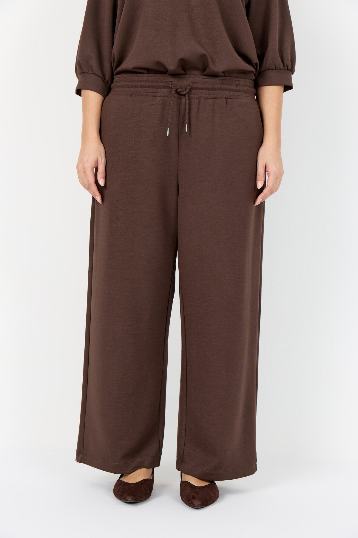 WA-SABINA 2 are Pants made with a blend of 48% Modal, 48% Polyester, and 4% Elastane. These comfortable pants feature a drawstring waistband and a relaxed fit for easy movement. Pair them with a simple top and sneakers for an elegant, laid-back look.