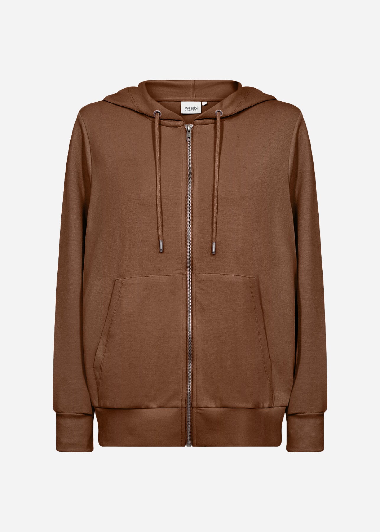 WA-SABINA 74 is a comfortable hoodie crafted from 48% Modal, 48% Polyester, and 4% Elastane. It features a full-zip front, two front and a drawstring hood and a loose fit. This elegant sweatshirt pairs easily with jeans or leggings for a casual look.