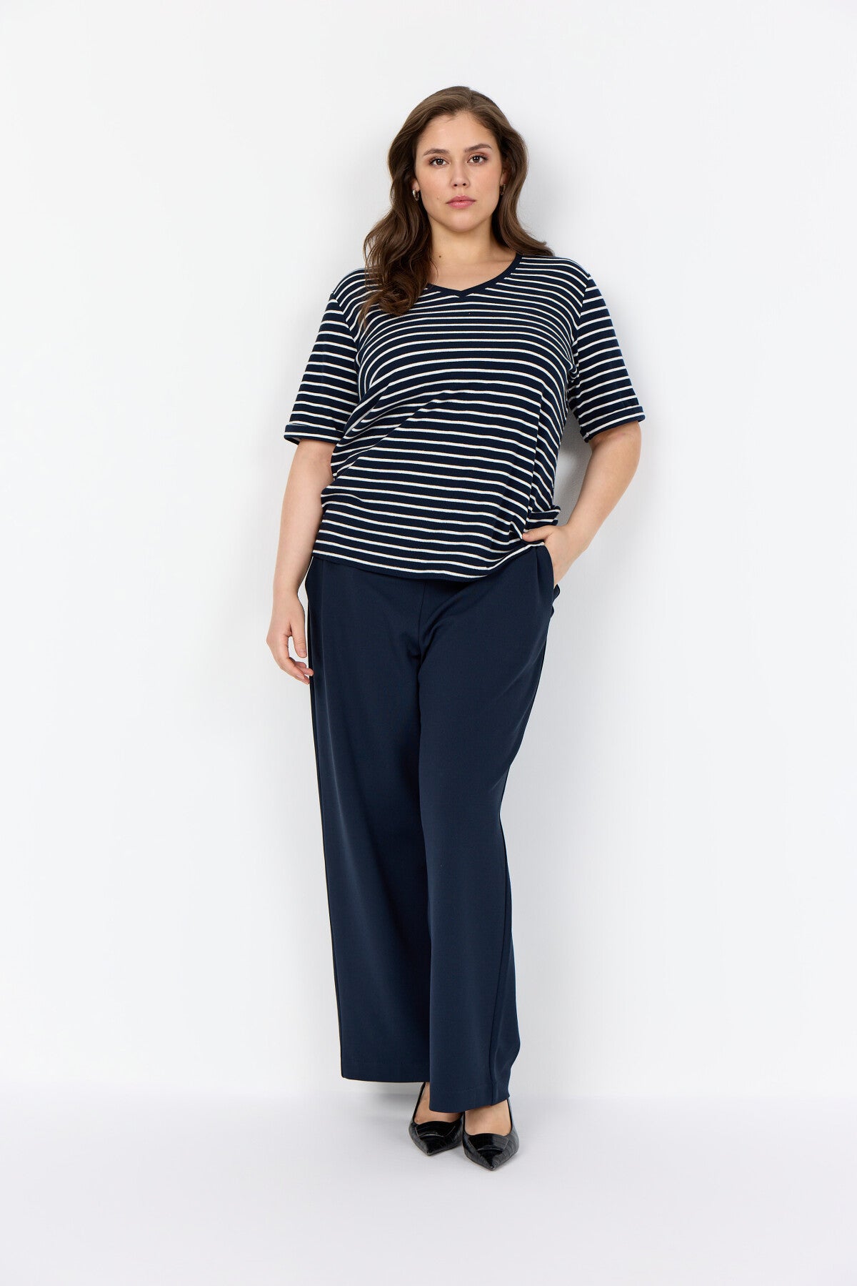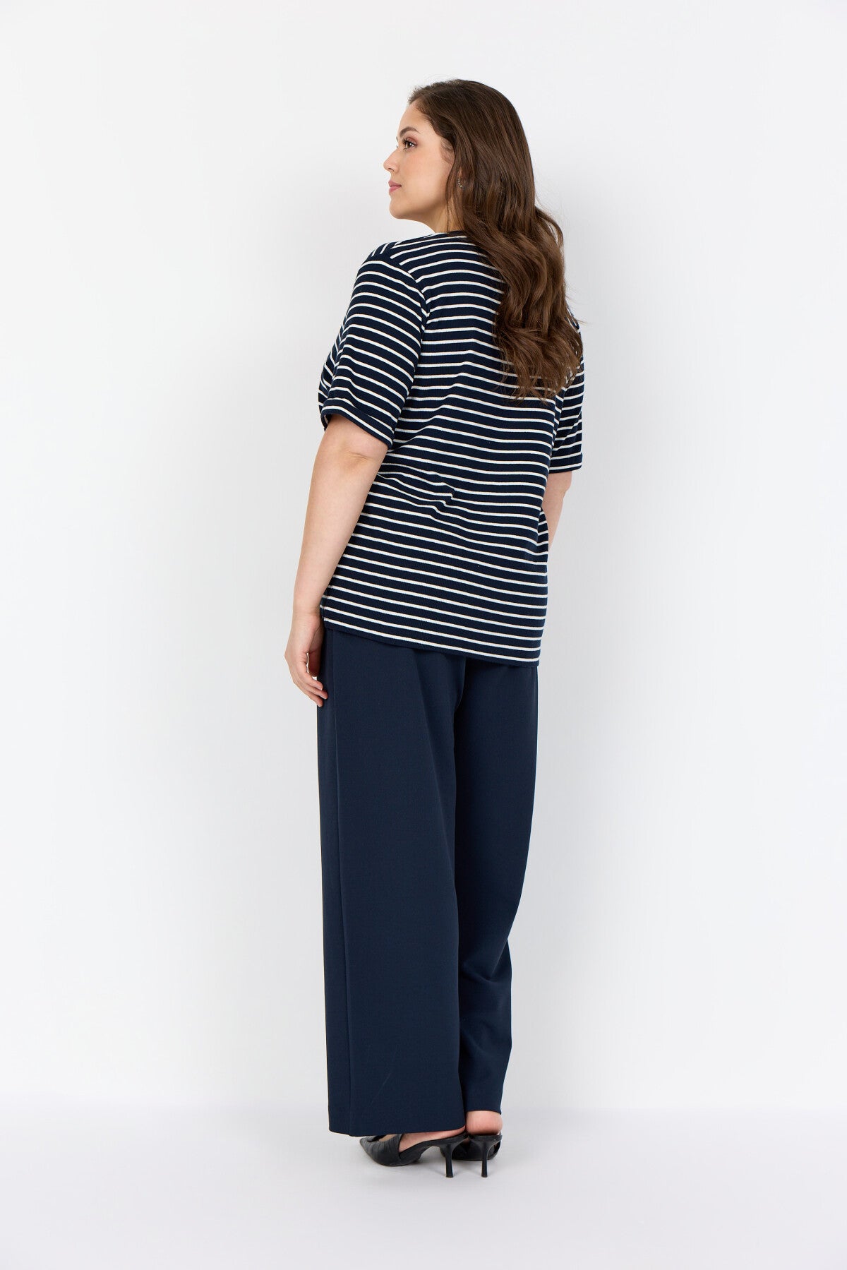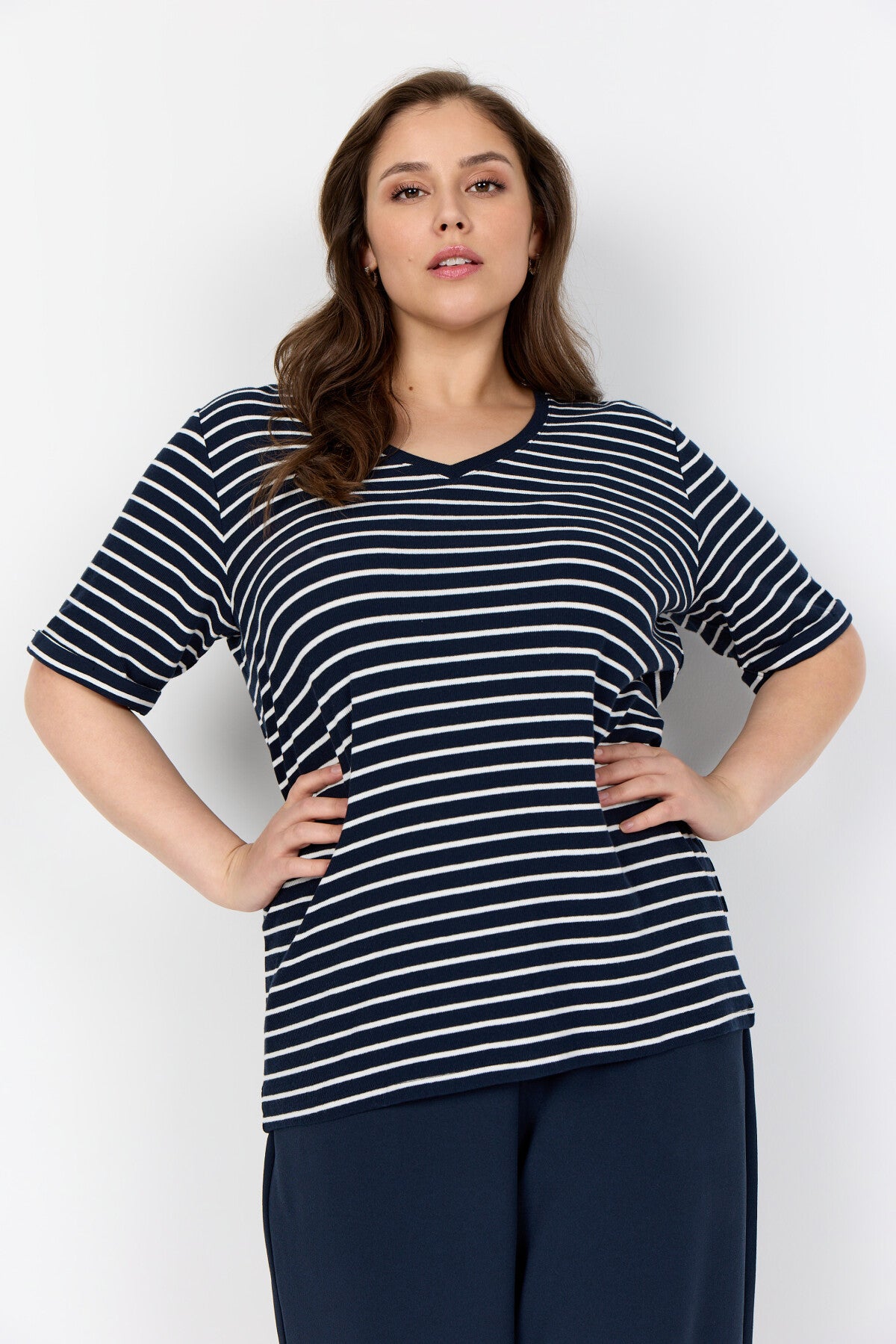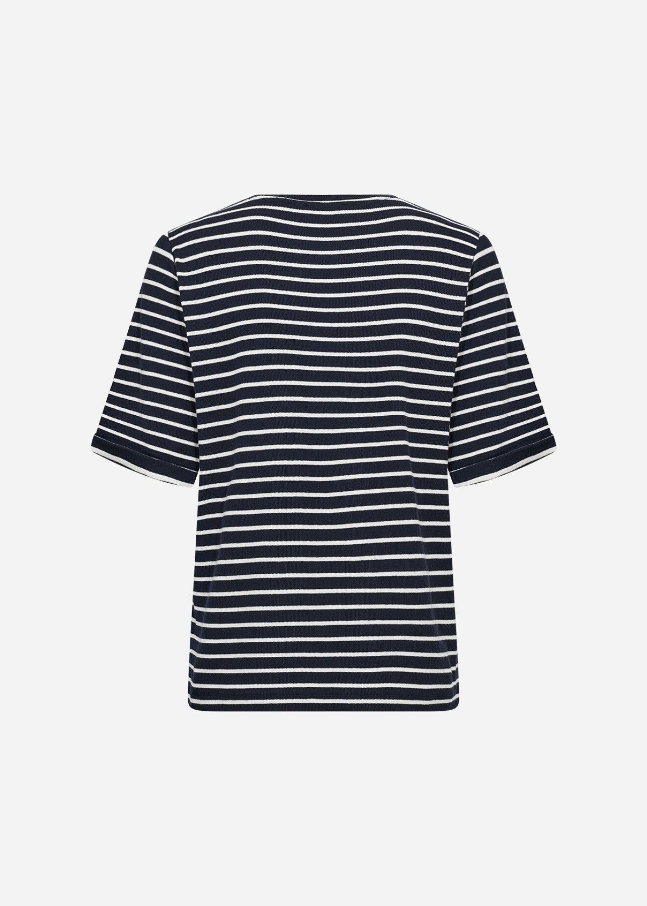 WA-SAKAR 1 is a basic T-shirt made from 65% Recycled Cotton, 30% LENZING™ ECOVERO™ Viscose, and 5% Elastane. It has a V-neck collar and features a striped print throughout. Pair this cool and unique T-shirt with jeans or shorts for a relaxed look.